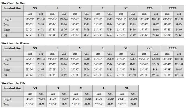 Different size chart for different gender, so please kindly leave us a note of your gender (Man, Woman, Kid) when you choose the size. (E.g. Kid XL)